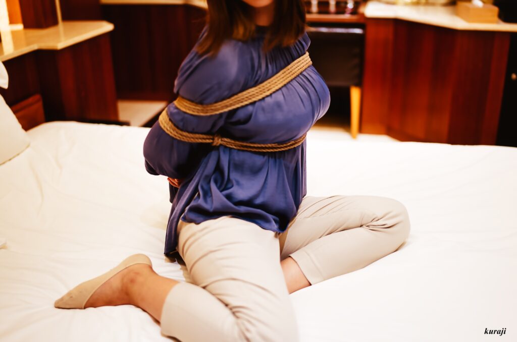 室内照明と明るいレンズからなる浅い被写界深度の緊縛写真。 「沖縄や福岡をベースに緊縛撮影」